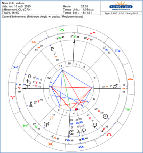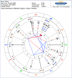 Gabrielle nous ayant précisé que sa visite au poste de police s’est déroulée entre 13h et 14h le 19 août à Longueuil, nous découvrirons par simulation que le Soleil en Lion était conjoint au MC à 12 :57 (voir le 2e thème). Le Soleil en dignité devient donc angulaire, tout comme le maître de l’Ascendant, Mars. On comprend mieux maintenant la position d’exil de Mars, en maison VII. Gabrielle réalise que sa frustration et son manque d’attention, avec Saturne et Neptune à l’Ascendant Bélier, ont contribué à son erreur et donc, au remorquage de sa voiture hors de l’enceinte du stationnement.