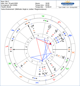 La Lune, située dans le signe du Cancer, forme des aspects majeurs successifs. A partir du dernier aspect séparant, elle décrit le contexte ayant précédé l’événement. Par la suite, chaque aspect appliquant décrira le déroulement des événements dans le temps. Normalement, le dernier aspect appliquant formé alors que la Lune est toujours dans le même signe, en indiquera la conclusion.